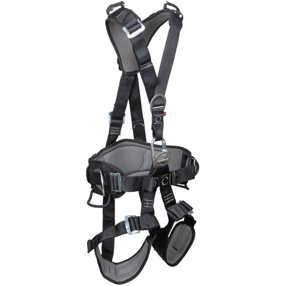 O anel peitoral é utilizado para ascensão por cordas e proteção contra quedas. Cinturão tipo paraquedista em fita de poliéster, acolchoado Thermo Form® e forro em tecido Air Mesh respirável nos ombros, cintura e pernas. Possui seis fivelas duplas (Fast Fit), sendo duas para ajuste das pernas (uma em cada), duas para ajuste da cintura, uma para ajuste da altura do ponto dorsal onde há um separador plástico “espaldar” e a outra para ajuste do peitoral. Possui cinco pontos de ancoragem em anéis metálicos, sendo um na região dorsal e o outro anel na região peitoral para proteção contra queda, dois anéis curvos laterais de posicionamento sendo um em cada lado da cintura e um anel para posicionamento na região ventral. Possui porta materiais com carga máxima de 2 kg, um de cada lado. Possui Indicador de queda localizado na região lombar. A cintura ergonômica Sua cintura semi rígida e de grande largura oferece sustentação e segurança únicos e uma ventilação excepcional.