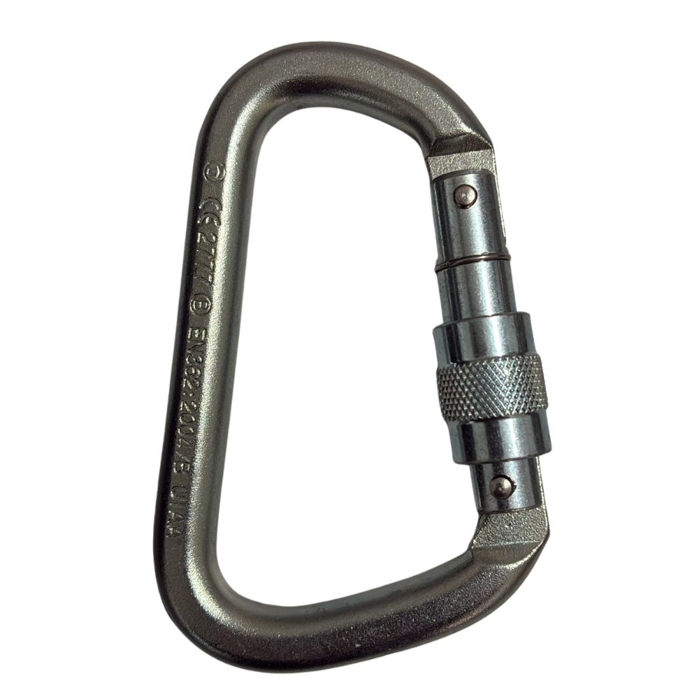 Mosquetão ou conector tipo “D” assimétrico de alta resistência; confeccionado em aço de diâmetro de 11mm de alto carbono de resistência superior devido ao aço e formato, 41kN; com acabamento anticorrosivo bicromatizado amarelo de durabilidade maior; com abertura de 22mm, proporcionado pelo seu formato garante mais conexões no mesmo dispositivo, sendo ideal para resgates; com dupla trava de segurança manual, uma automática e outra rosca manual; com excelente relação de custo benefício; com dimensões de 110.0 x 67.6mm e peso de apenas 208g tornando a melhor opção para atividades em altura de uso pessoal e resgate em ambientes industriais, esportivos ou resgate, pois o aço contribui para grande resistência e mínima manutenção; produzido sob os mais rigorosos padrões de qualidade mundial para atendimento das normas internacionais e nacionais de segurança do trabalho em altura podendo ser utilizado para uso industrial, esportivo e resgate, CE EN362; CE EN12275; UIAA e NBR15837, tornando assim um dispositivo essencial em suas mais diversas aplicações, inclusive para unir mais pontos de ancoragens no mesmo mosquetão.